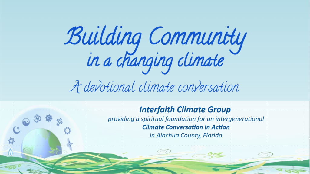 The Interfaith Climate Group supports outreach to faith-based and service organizations in Alachua County. We invite them to join Community Organizations Active in Disaster and support the County Climate Action Plan with individual and collective action for a resilient future.